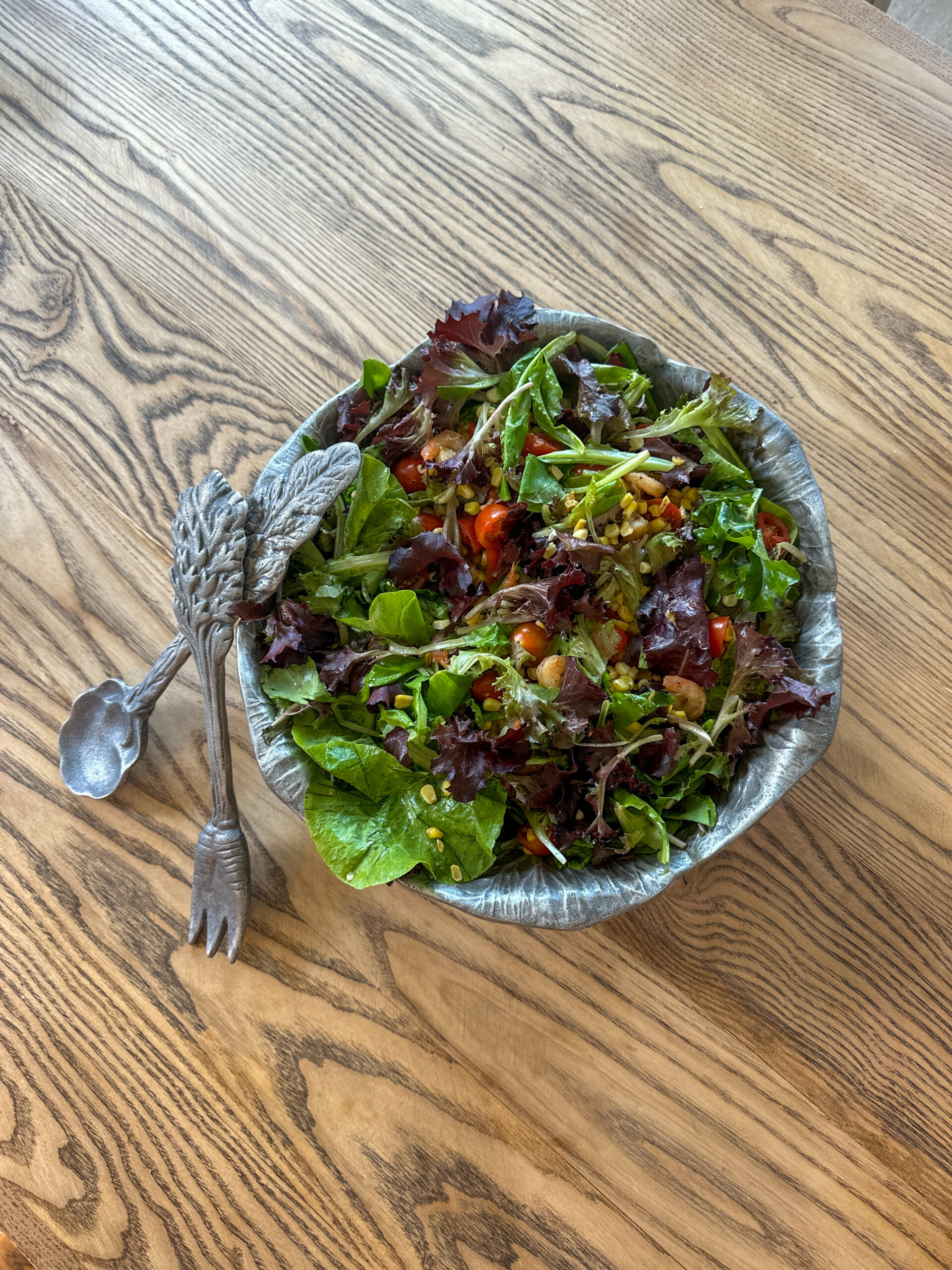 Add 2 bags lettuce, tomatoes + corn to a large bowl + toss to combine; divide salads between plates, top with shrimp, season with salt/pep + an extra drizzle of olive oil