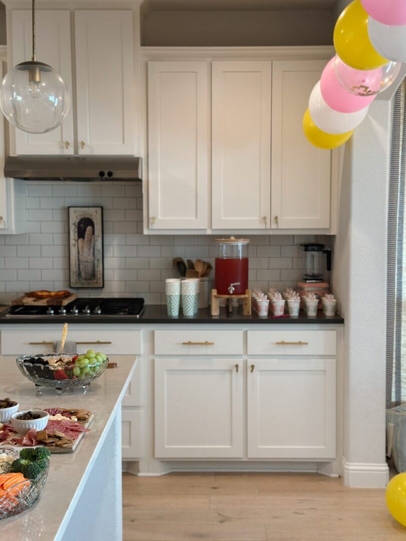 Bunny themed foods include carrots, cheddar bunnies, fruit snack bunnies, and bell peppers. I served classics like fruits, vegetables, turkey rolls, and a charcuterie board. Of course I added some of Averi’s favorites like strawberry lemonade, macaroons, cake, chocolate chip cookies, and cheese pizza.